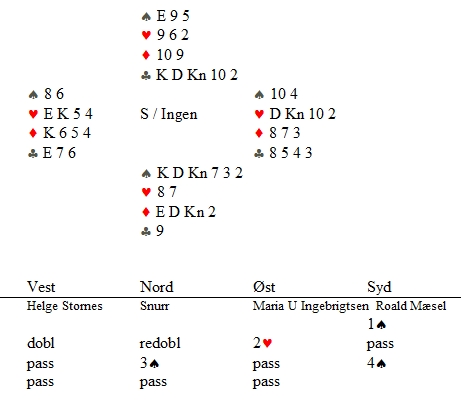 Helge Stornes spilte ut hjerter ess og Maria la, helt etter læreboka, hjerter dame for å vise et inntak. Så en hjerter til knekten og skift til ruter. Ikke magisk for deg som har spilt bridge lenge, men for en nybegynner er dette motspillskunst. Flere motspill av langt mer erfarne bridgespillere ga bort ti stikk i sparkontrakt.