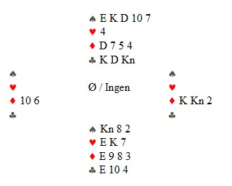 Øst åpner i 1 NT med pass rundt. Utspill Hjerter 10 til liten-liten og damen. Så spar til tier, liten kløver til damen, liten ruter til kongen, og liten ruter fra Thor Dag som spillefører ikke klarte å legge damen på. Resultat tre beit (!) etter en god lasj i utspill og underspilling av ruter E.