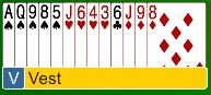 Du vet du ikke blir utmeldt med 5-4 i major så du starter med en pass. Det går pass til venstre og makker åpner med 1 hjerter, pass med nestemann og så er det du.... Du melder vel tre kløver dersom dere bruker splinter, det samme gjør du om du spiller Bergen, og så når det er din tur igjen har makker meldt 3 ruter som vel bør være kontrollmelding.