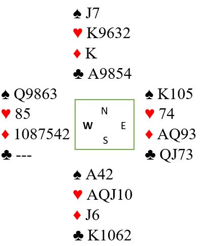 Løsning: Etter to runder trumf, spill ruter knekt som trumfes hos nord. Ett sparstikk må tapes uansett, så gi bort det stikket med liten fra begge hender. En av dem kommer inn og spiller spar tilbake til esset. Så trumfes den tredje sparen. Her er resten av kortene om det fra start sitter sånn som i vårt fullstendige diagram:
