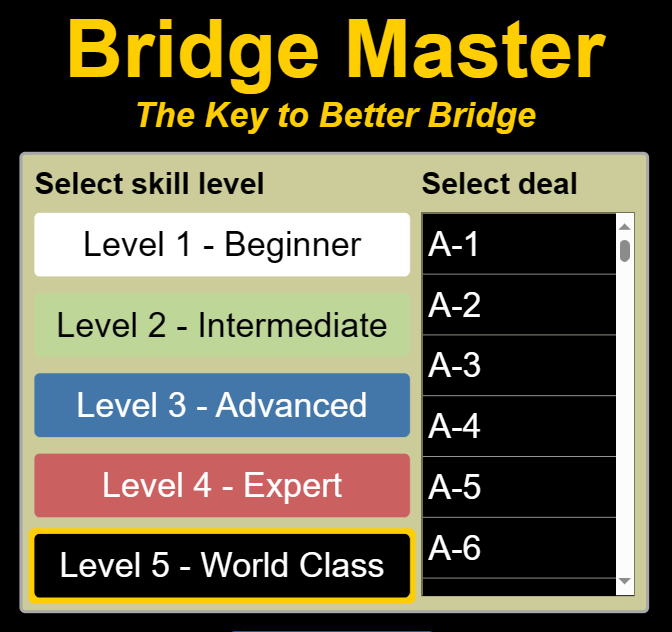 Spillested: Bridgehuset, Brattørveita 10, 2.etg, Trondheim Premiering: Individuelt pr. sesong (vår, høst). De 5 beste resultatene teller. Poengserie, avhengig av plassering. Hvis 20 par deltar, gir 1.plass 20 poeng, 2.plass 19 poeng osv Antall spill: 21 spill, 3 spill pr. runde. Påmelding: Ved oppmøte. Alle kan delta (en eller flere dager) uavhengig av alder. Bridge Master Spill Bridge på PC Spill Bridge på Telefon eller Nettbrett Her finner du 600 spill som kan brukes til både egen-opplæring og tidsfordriv. Spillene er ferdig gitt og meldt. Oppgaven er å spille hjem kontrakten.