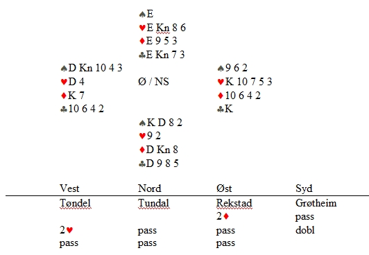 - Både TL og NS ser på kortene når de avgjør resultatet av spillet. Det dømmes til en kontrakt som aldri er meldt og som står fordi sitsen er gunstig. For det første ville ØV meldt annerledes hvis Nord fikk endret sin melding til noe annet enn 2hj. Hvis sparkutten IKKE hadde gått, ville NS IKKE protestert og TL ville IKKE justert resultatet på spillet. Den ene siden får melde ideellt utfra kortenes plassering, mens den andre siden må passe.