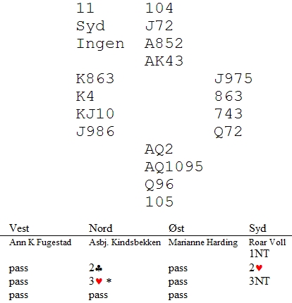 Øst meldte 2kl (!) og to passer fulgte. Nå var det en god venn av Nils som hadde meldt 2kl og det var nesten med vondt i hjertet han doblet. Det kom sikkert ikke til å gå pass rundt.