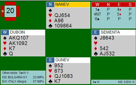 Jeg mener at Italia spiller 15-17 i alle soner, i alle fall er det det som står på systemkortet. På den annen side bløffer sjelden spillere på NT-intervallet med balanserte hender, så de har sikkert endret. 3ru viser kløver, mens 5sp ber makker se på kvaliteten på sparen. Faktisk står 6kl/7kl og 6sp på omtrent det samme, nemlig at sparen løser seg uten taper. I alle fall med hjerter ut. 6kl var gevinstspill siden Bulgaria ikke kom lenger enn til utgang.
