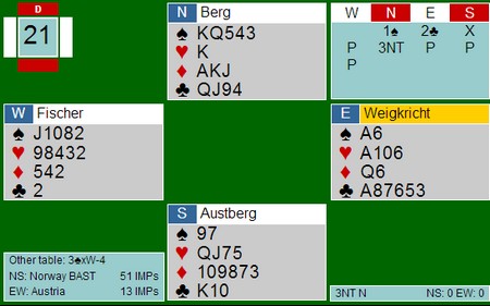 Det var mange interessante hender, hvorpå undertegnede og Ole har funnet ut at man må gjøre noen justeringer på systemet. Det er ofte man dukker opp i situasjoner som gjør ting vanskelig, disse situasjoneene burde man analysere, samt se om det er noe man kan gjøre for å ta tak i dem. Jeg har hele tiden sagt at man ikke må diskutere posser basert på hender, dvs akkurat den hånda man har forran seg osv. Det man derimot kan diskutere/justere er situasjoner som oppstår, dvs når motparten melder inn det eller det, eller når man sitter å spiller et motspill, ikke analyser det ene spillet alene, men diskuter hva de forskjellige kastene skal vise. Igjen på et generellt nivå, ikke HÅND FOR HÅND.