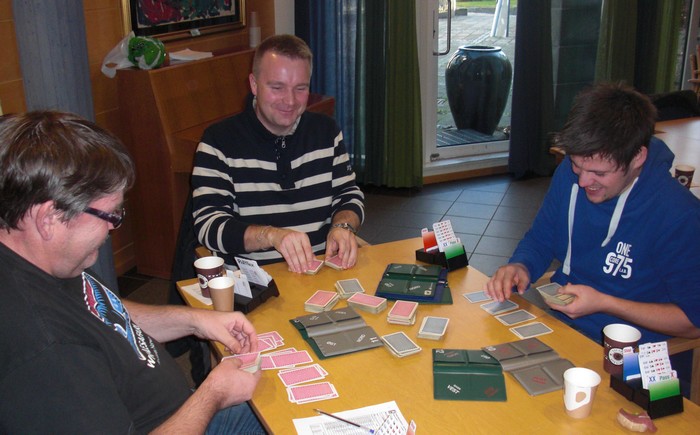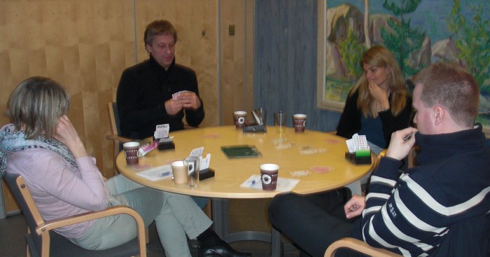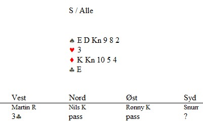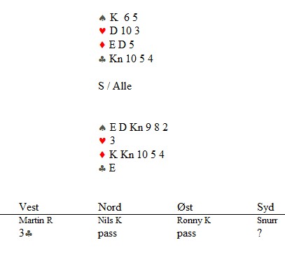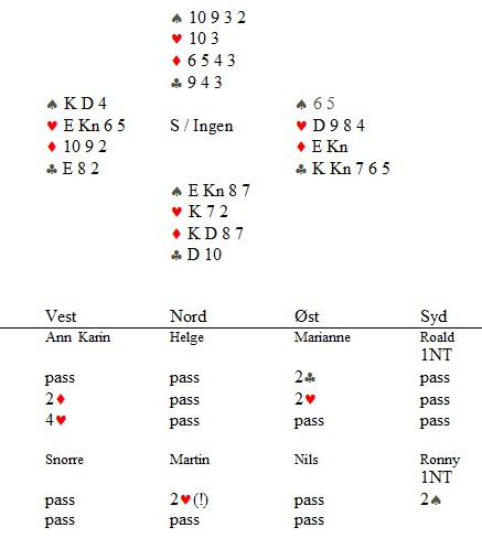 Marianne Harding, Snurr, Ann Karin Fuglestad og Nils 200 Kvangraven Noen ganger handler bridge om å "komme på" rett melding. Jeg klarte det ikke i spillet under, men det gjør sikkert du? Ja, hva blir det til? Du trenger faktisk ikke mer enn EDx(x) i ruter hos makker før det står slem (i verste fall på en sparkapp gjennom han som ikke sperreåpnet), men hvordan kan du finne ut av det? 4ru som "Jumping Michaels" bør være mulig å komme på. Det er krav til utgang med ruter og en major. I verste fall kan en komme i 5ru der en skulle vært i 4sp, men oppsiden er mye større. Under ser du Nils sin hånd og for han er det nå snakk om seks eller syv med de honnørene han har. Martin Reinertsen, Nils Kvangraven og sørlandets største talent, Ronny Kolnes.