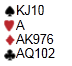 Nord er giver, og etter to passer åpner syd i 3. hånd med 1 hjerter. I første omgang er det riktig å doble med den sterke hånda, og nord hopper i 3 hjerter. Denne alerteres av syd som "0-4p og 4+kort hjerter", også kjent som Bergensk fiskesuppe eller Bergen raises. Det passes igjen rundt til deg i vest, og hva gjør du nå (alle i sonen)?
