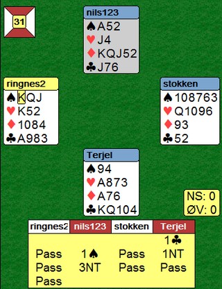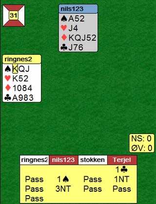 Boye dobla 3NT for ikke å få spar ut. Selv om det var ni stikk, gikk det ikke an å få tak i dem med normal spilleføring.