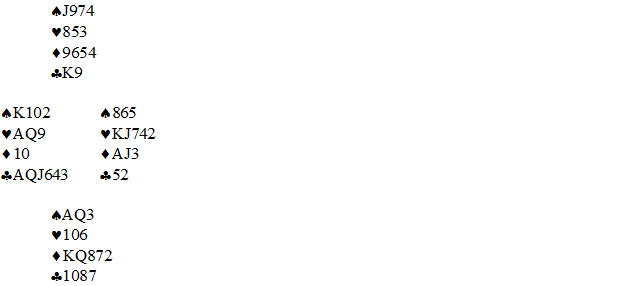 Da femte kløver ble innkassert, var sør skvist. Han måtte kaste sine hjerterhonnører for å hindre at bordet tok to ruterstikk til slutt, men da sikret hjerter knekt det nødvendige ekstra stikket.